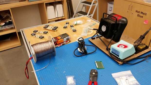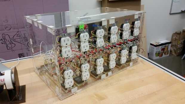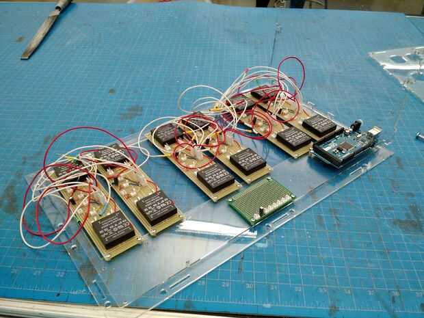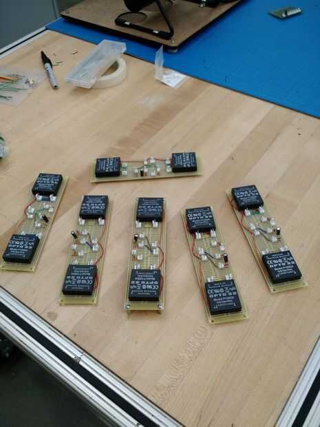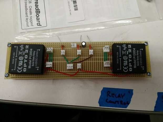 Cada conjunto de paneles (dos adoquines, un asiento) requiere su propia placa de circuito. Cada tabla consta de tres entradas del interruptor, las salidas correspondientes para la Arduino a sentido los interruptores, optoacopladas dos relés (uno para cada salida ser controlada), dos entradas desde el Arduino para controlar los relés, alimentación de 5V y tierra entradas para las entradas circuito de pequeña señal y 120V alta, neutrales y de tierra para el circuito de potencia. Seis copias de esta tabla deben soldarse manualmente, además de un tablero de distribución de energía. Una caja de acrílico debe ser láser corte con agujeros debidamente separados para los enchufes, interruptores y circuitos.