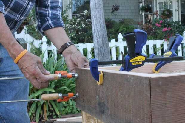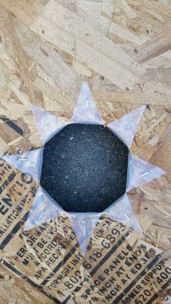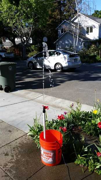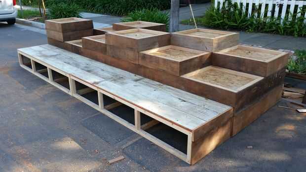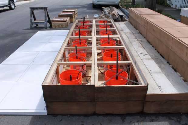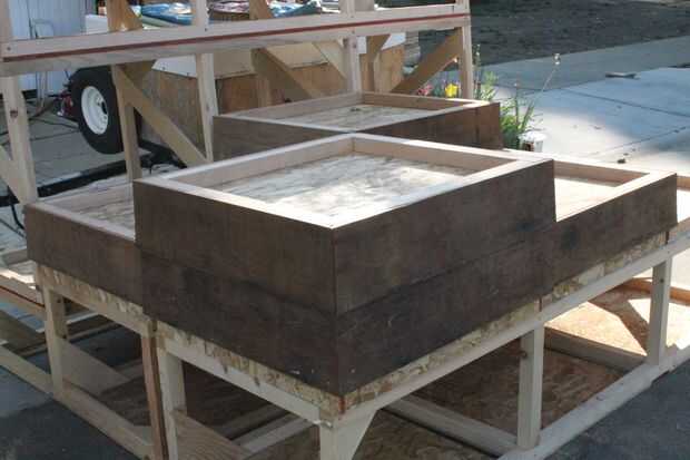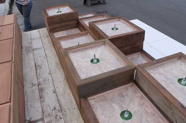 Las jardineras se construye de madera contrachapada u OSB y caras, el acabado de la opción. En la cara superior láminas de plástico se colocan bajo el borde de drenaje en un 4" agujero en el centro, que es cubierto con una tapa de drenaje (con un agujero ensanchado). Esto permite agua que dispara fuera de la fuente para drenar hacia el cubo.