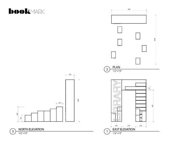 Nuestra propuesta inicial era inicialmente para una estantería "portal" con pilares de estantería más pequeños conducen a él (ver imágenes). Sabiendo que hemos querido diseñar algo relacionado con la biblioteca, nos ocurrió la idea después de visitar el sitio de extracción de líneas ópticas de la calle mercado. Había trabajado a través de nuestras ideas por dibujar con lápiz y papel, luego utiliza AutoCAD para elevaciones dimensionadas y plan. Rinoceronte nos permitió modelar fácilmente en 3D y Adobe Illustrator y Photoshop nos ayudó a crear la representación del concepto y el diagrama.