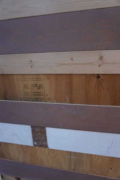 Cortar las tiras de madera recicladas en longitudes de 2'. Usando la pistola de clavos, clavo las tiras horizontalmente en la parte exterior de las dos columnas y a un lado del dintel y la media 4' del otro lado del dintel.