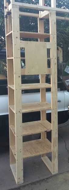 En las columnas, decidir donde se colocarán sus estantes. Donde va cada estante, ranura ranuras en el 2x4s vertical del marco. Los estantes se deslizarán en estas ranuras.