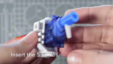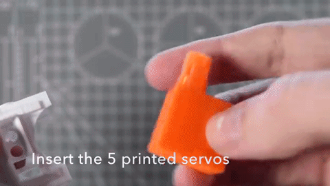 Para los servos impresos 5 (naranja), simplemente insertarlos en las extremidades y la cabeza. Utilizan los mismos pines como los servos, se ajustan para la inserción en el torso.