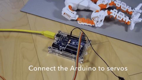 Conecte cada cable de señal del servo con el conector de salida digital enumerado en el código de Arduino del siguiente paso. Pines por defecto son: