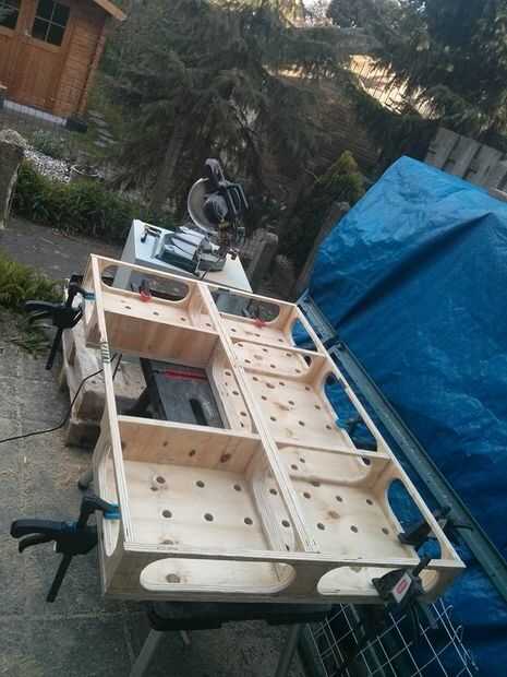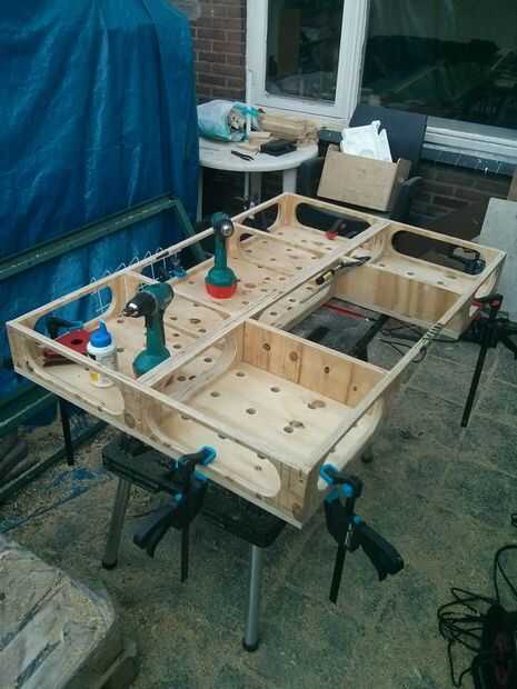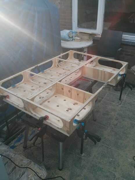 Tiempo a añadir todo junto: Empecé por voltear la parte superior por lo que podría alinear las vigas del centro más fácilmente (no hay que medir cuidadosamente ya). Luego expuso el marco externo, afianzado con abrazadera y puso en el resto de la estructura interna y fija lo que pude.