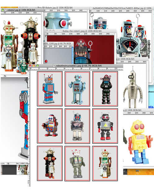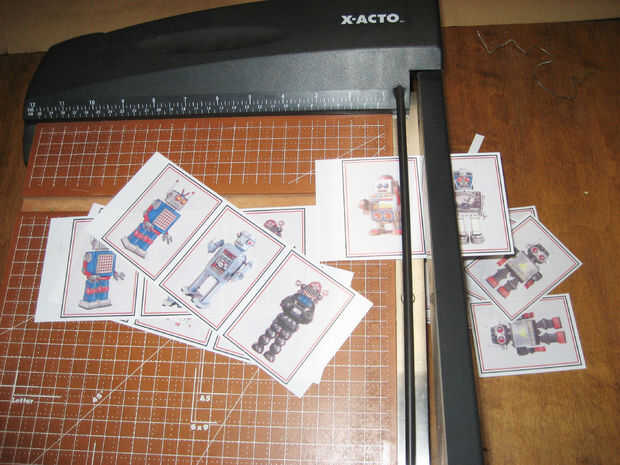 La primera cosa a hacer es recoger las imágenes-mina son de google para este proyecto solamente. Una hoja de shrinkplastic tendrá nueve 'azulejos', cerca de 2 "x 3". Si sigues las baldosas juntas, un corte entre los dos dejará un borde igual en cada uno. Utiliza el tipo de inyección de tinta e imprimir los bots *, luego cortar con un papercutter. Puede utilizar xacto y regla o cualquier cosa que funcione para usted.