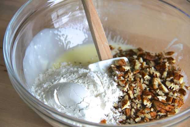 Derretir la mantequilla y agregue la nuez/nueces, azúcar y harina. Este revolver todo hasta que es agradable y desmenuzable - debería ser como arena húmeda y sujetan cuando usted presiona en su palma. :)
