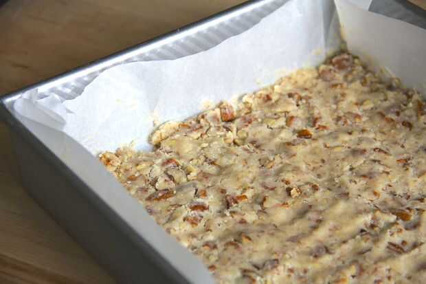 Línea de una bandeja para hornear con papel pergamino y volcado en la corteza. Presione hacia abajo en la bandeja por lo que es agradable e incluso.
