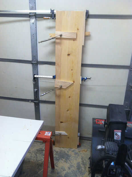 7. toma tus pinzas de madera y junte todo. Un par de abrazaderas c ayudan a reducir la cresta de la Unión. Eso es lo de utilizar solamente 4" premium corte madera. Es ancho perfecto para utilizar las abrazaderas en C en. No olvide su madera para evitar marcas de pies de ser empujado en el pino suave.