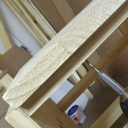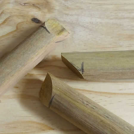 8. corte 2 clavijas para los lados, cada uno con un ángulo de 45 grados para formar el marco. Mis tacos son 25mm de diámetro y son demasiado grandes, pero si usas tacos de 20mm de diámetro las esquinas deben ser perfectas. Cortar la espiga posterior, para que usted puede ajustar la longitud para caber.