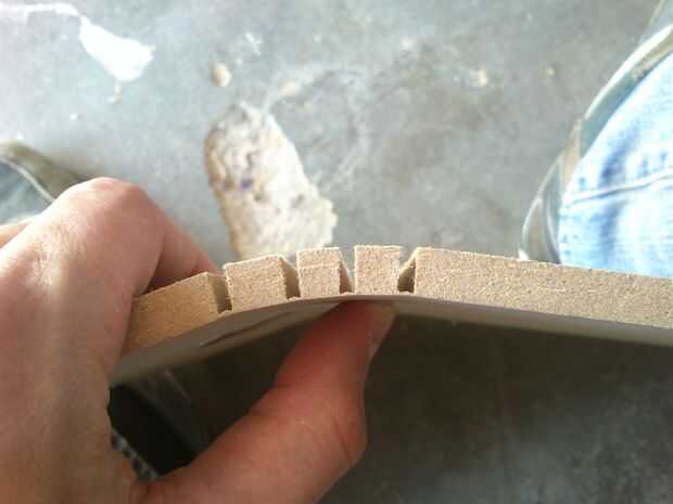 4. Ajuste la sierra circular portátil que la cuchilla hará una incisión de sólo aproximadamente 7 mm de profundidad. Prueba este fuera de la pieza de MDF de repuesto. Si el corte no es lo suficientemente profundo, va a ser difícil doblar y podría incluso romper. Si es demasiado profundo, el material será demasiado frágil. Ver imágenes de abajo para cómo poco profundo debe ser el corte y hasta qué punto puede doblarla.