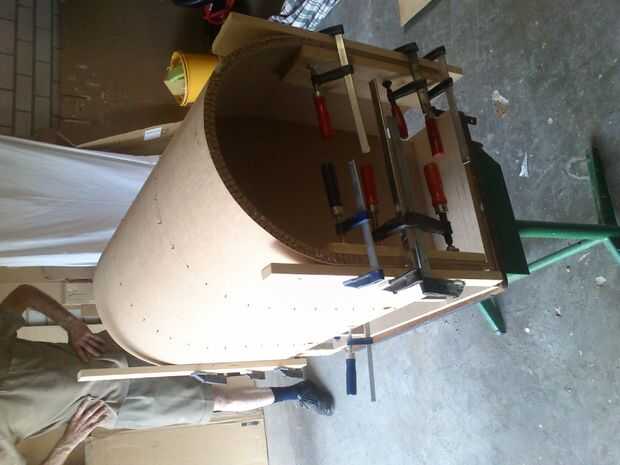 Lo más probable que se deforme durante el curado de la cola es el espacio entre las placas MDF inicia de los extremos de la sección recta y la curva. Para evitar la deformación, añadir algunas abrazaderas de madera y pegamento para sostener las placas juntas.
