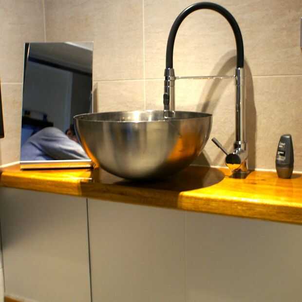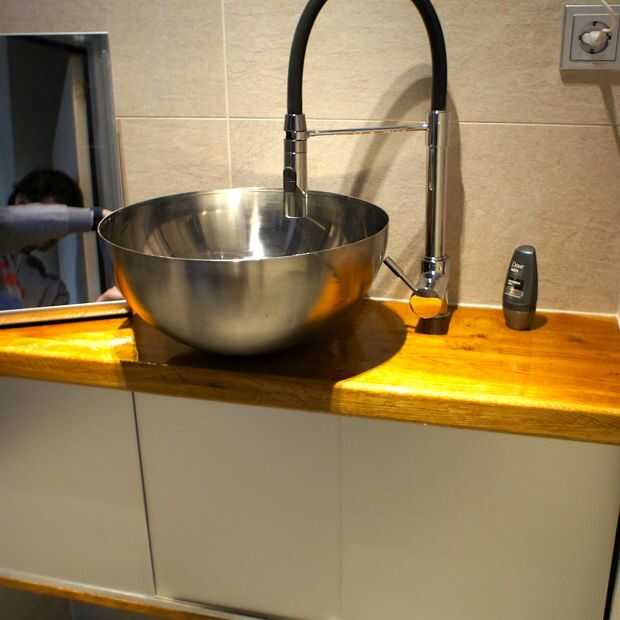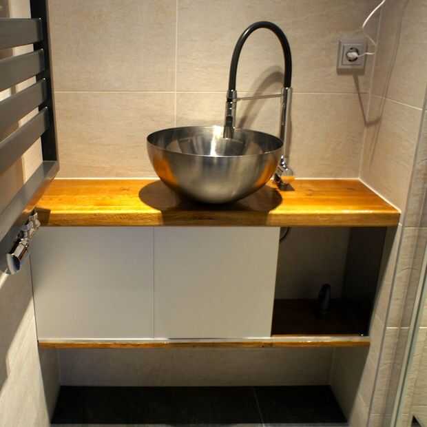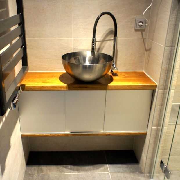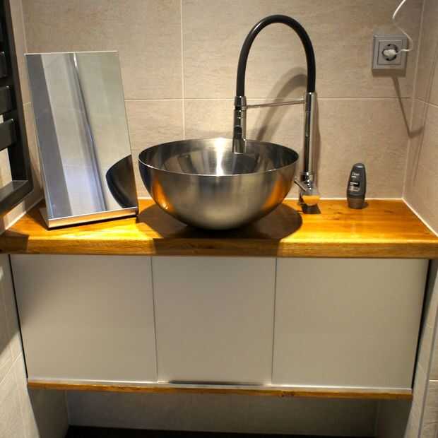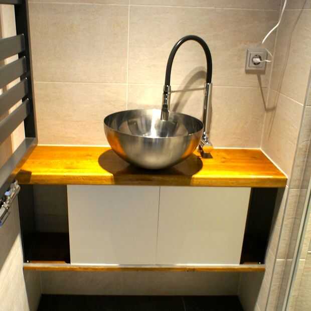 Estoy realmente orgulloso con el resultado. La madera y el metal se ve muy bien en mi cuarto de baño y de esta manera montar un mueble agradable en mi espacio muy pequeño sin lo cólicos.