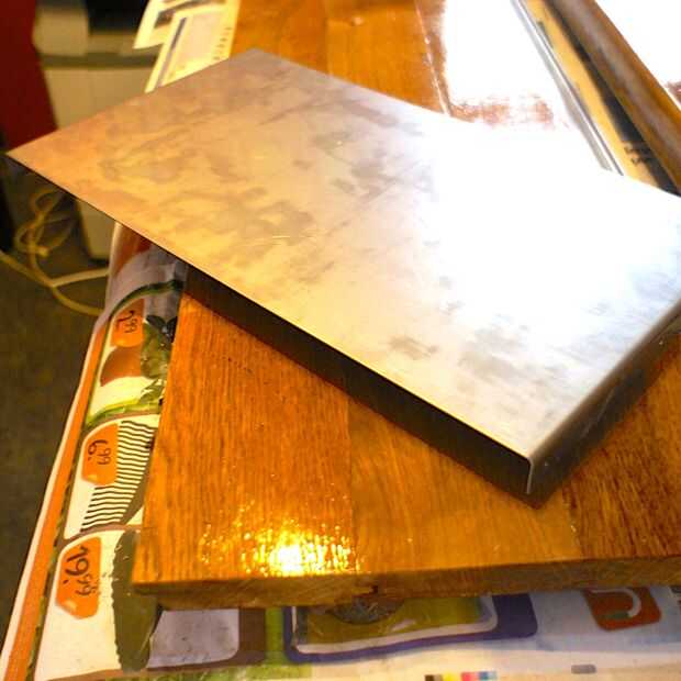 Para los lados del gabinete usé 1 mm Inox 440 x 220 mm de la placa. En la parte superior e inferior se establecerá 20mm a 90 grados así que nos quedamos con una altura de 400 mm. Esta altura debe ser bastante exacta. (así que tuve esta placas dobladas por profesionales)