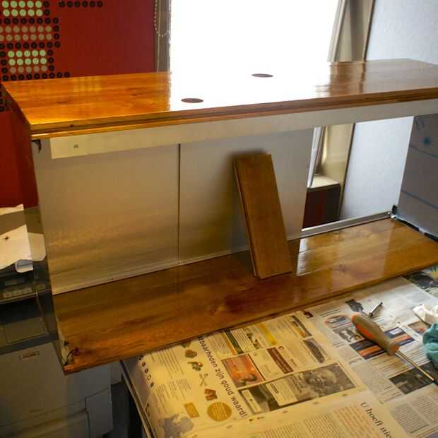 Colocar los lados en el mueble para poner la parte superior e inferior juntos. Poner la tabla de abajo sólo un milímetro más al frente de la parte superior.