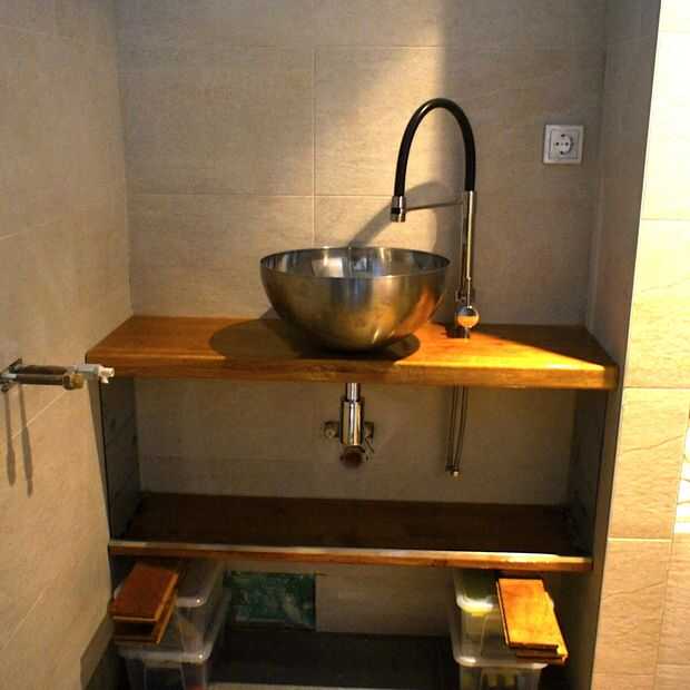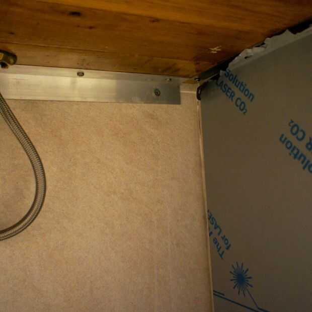 Porque el fondo se puso un poco al frente, el gabinete será ahora ligeramente colgar hacia adelante. Poniendo alguna cuña o algo detrás de la parte inferior y la pared, podemos conseguir la tapa del gabinete nivel exactamente.