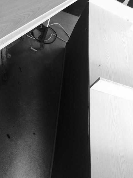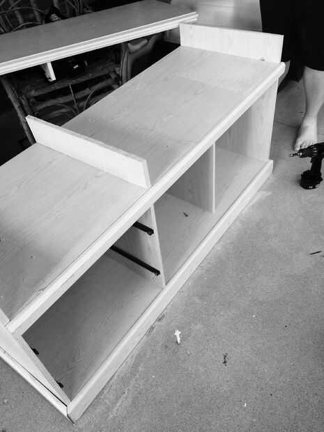 decidí que quería un espacio para mi reproductor de DVD y el cable de la caja así que corte los lados a 4 pulgadas por encima de la primera bandeja i total de 28. Luego corté las piezas alrededor de la bandeja del dvd 4 para un soporte medio. Aseguraron estos 4 pedazos de la parte inferior con tornillos para madera.