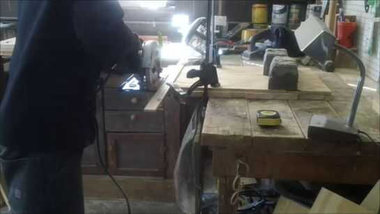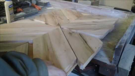 Lo hice dibujando una línea recta hacia abajo de los sabios de longitud media, luego por la mitad de la anchura. Esto creó cuatro cuadrantes a la línea de mis tablones, con ellos encuentro todos en el medio. Una vez que les arreglan lo justo, yo había cubierto con pegamento para madera y ponerlos en su lugar. Puse un par de 2x4s sobre ellos con un montón de ladrillos en la parte superior y lo deje reposar toda la noche para dejar que el pegamento haga lo que hace.