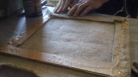 Para la parte delantera de la caja, simplemente corté un trozo rectangular de madera hacia fuera. Luego corté a la mitad de la pieza, creando un marco realmente simple y eficaz. Coloque el marco sobre un trozo de arpillera, pulveriza la madera con adhesivo en aerosol y estiró a la tela y había pegado abajo.