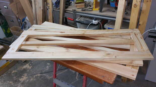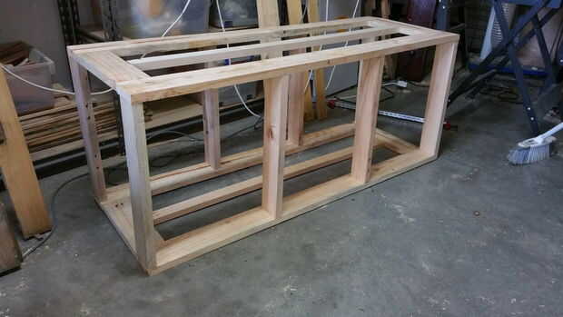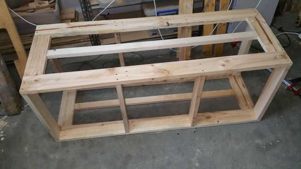 Montar el cuerpo más grande con 2 de los marcos y 8 espaciadores. Fijar todo en su lugar y pegados y atornillados en de la parte superior e inferior para guardar tornillos de bolsillo. Estos se ocultarán una vez se agregan las tablas.