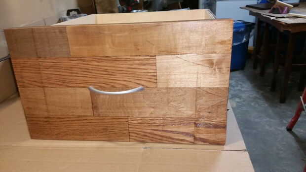 Aproveché toda la madera de palet de cortes que tuve que añadir un patrón al frente de los cajones. Me aseguré que cada una fue cortada cuadrada y longitudes diferentes. Estos luego fueron pegados a los frentes de cajón y coloqué algunos pesos en la parte superior para sofocar así clavos no eran necesarias.