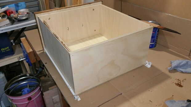 Primero instale a la gaveta según las instrucciones que vienen con. Entonces medí la distancia entre ellos para determinar el ancho del cajón. Utiliza mi sierra circular para cortar la madera en tiras para todas las gavetas continuación, utiliza la caída de sierra para cortar a la longitud. Los cajones fueron pegados y clavados juntos.