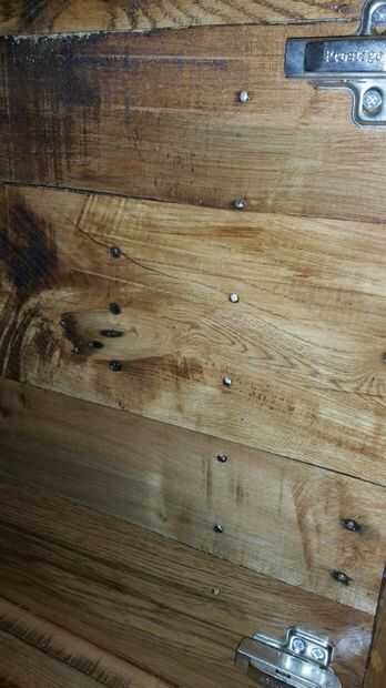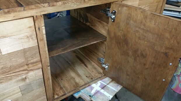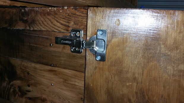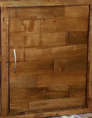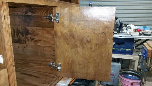 Hice la puerta de la misma manera hacen los frentes de cajón. Corté madera plataforma de cortes para diferentes longitudes, asegurándose de que cada uno fue cortado cuadrado. Éstos entonces fueron pegados a la puerta y coloqué algunos pesos en la parte superior a las tablas por lo que no se necesitan clavos.