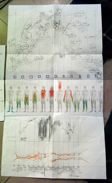 en mi caso como el masaje la coreografía es muy simple y cíclico es posible dibujar un cuerpo humano deformado adaptado al código de tiempo + líneas naranja para mi camino de las manos.
