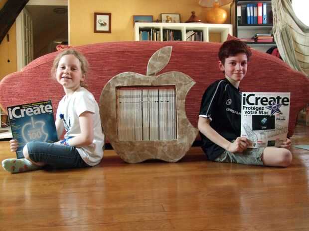 Mi propuesta será: mis dos niños con un muebles de cartón como insignia de Apple.