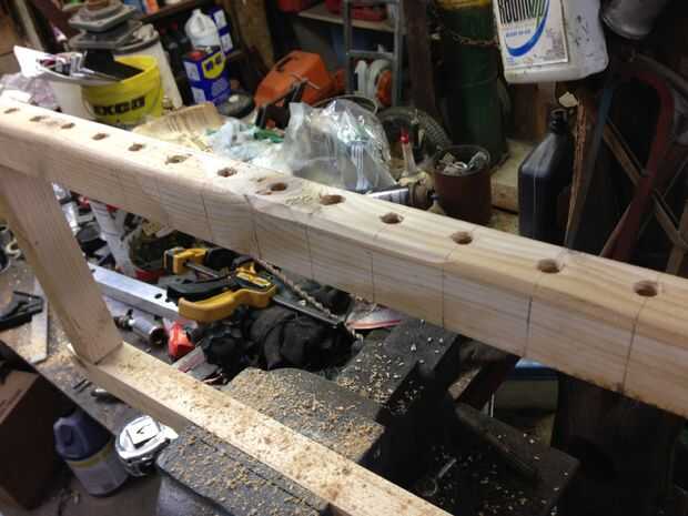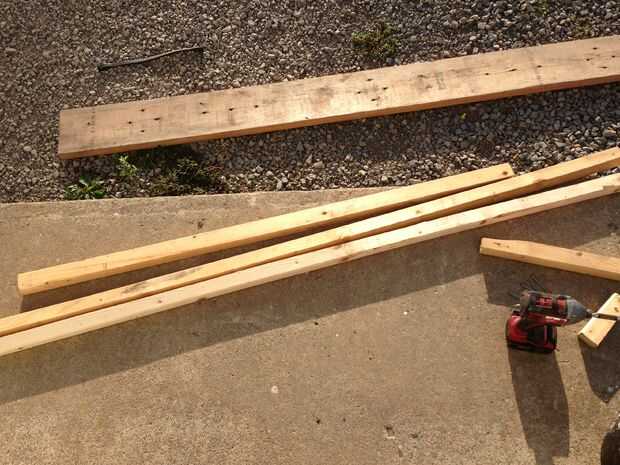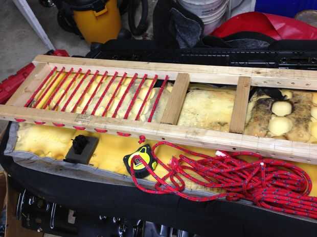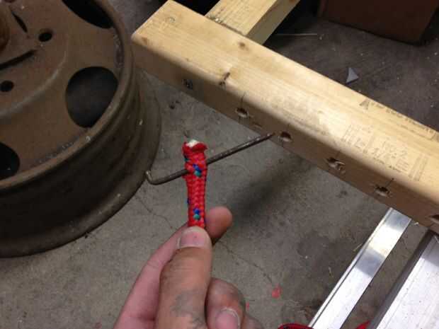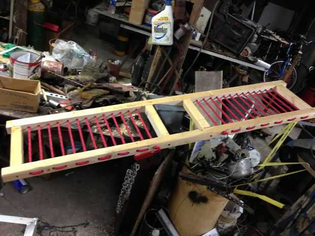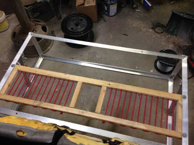 siguiente necesitarás algo para apoyar el colchón inferior. Mi solución fue fijar algunos 1 x 4 en toda la longitud de la estructura con cierta cuerda tejiendo a través de actuar como resortes. Corrí un clavo doblado a actuar como una aguja mientras que rosca la cuerda por los agujeros casi apretados.