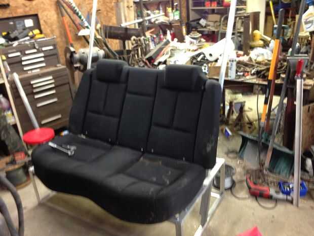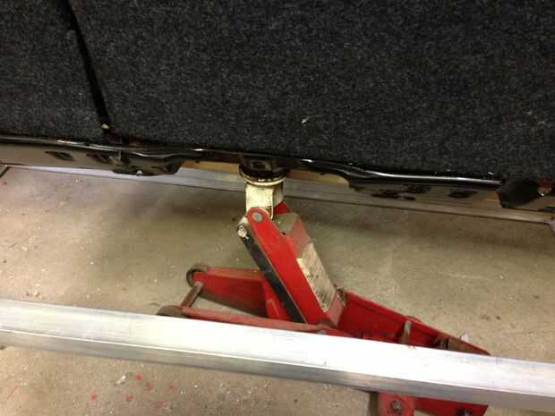 No estoy muy seguro de cómo describir este paso estaba esperando mis fotos sería explicarlo mejor pero haré mi mejor esfuerzo. Puse el respaldo en las piezas de aluminio de ángulo vertical. Configurar a un gato debajo del coche para que lo apoyen y así sé cuánto necesito perno, también para que quede correctamente en el asiento inferior.