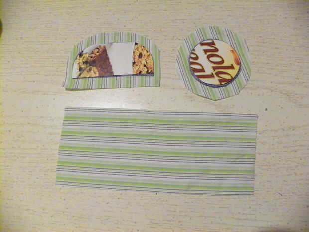 Cortar un círculo de tela 4". Esto va en el cojín del asiento. Cortar una pieza 3 "x 5". (Curva 2 de las esquinas). Corte una pedazo 4 "x 9 1/2" para ir alrededor de la lata.