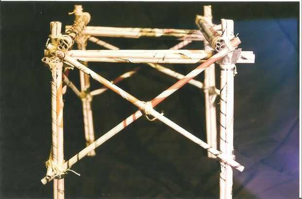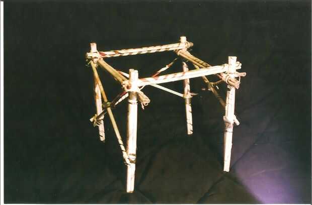 No dude en añadir los pares de palo de "X" en este momento. Estos impiden que las piernas girando independientemente. Probablemente hay un amarre profesional para esta instancia, sin embargo, yo simplemente les ataban a las piernas por envolver todo en cuanto a lo que se sentía bien. Como se puede ver en la imagen, sólo utilicé 3 de los pares de palo de "X", añadiendo un cuarto par aumentaría la estabilidad, sin embargo quería que fácil acceso al espacio por debajo de una las 3 pares sostiene bien.