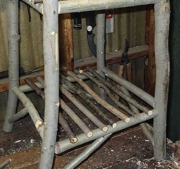 Clavar la ramita, cortar a la longitud y hacer otro. Me gusta usar unos 7 ramitas en la parte superior y otro 7 en el estante inferior. El estante inferior debe funcionar a 90 grados a la parte superior. Hace la tabla más fuerte.