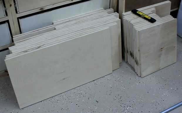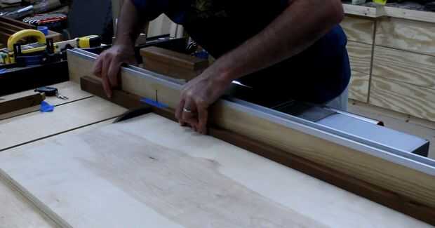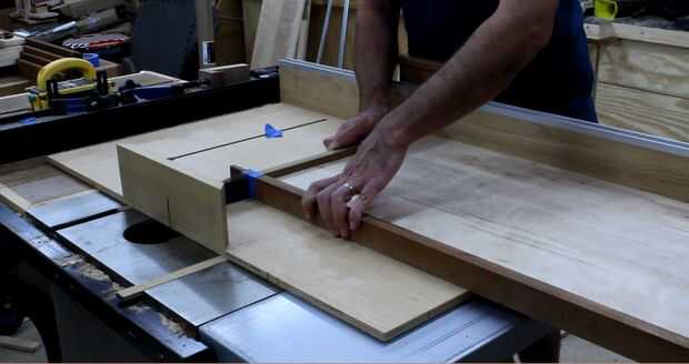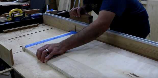 Una vez que todos los carriles y ajuste han pegado en la, entonces será tiempo de corte transversal les hasta dimensiones finales. Usé mi sierra de mesa con un trineo transversal instalado porque para mí este fue el mejor y más seguro método para cortar a la longitud. También se podría cortar con una sierra de brazo radial o deslizamiento de inglete compuesto vio si tienes suficiente profundidad de corte. Porque los paneles son más de 16" de ancho con el recorte adjunto elegí la Sierra de mesa usando mi trineo de corte transversal. Este método es bueno para un número de razones tales como cortes de separación cero proporciona un corte limpio en la moldura y con una hoja de dientes finos puede conseguir un corte bastante en la madera contrachapada también. En algunos casos, utilicé cinta de pintor azul para conseguir un corte limpio en la madera como se ve en la foto de arriba.