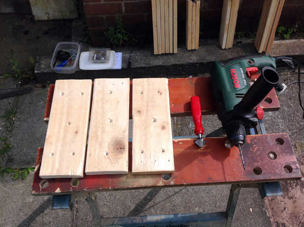 Para el exterior piezas marca las posiciones de agujero de taladro áspero. Hacía unos 45mm de cada extremo y desde lo 10mm del borde.