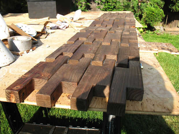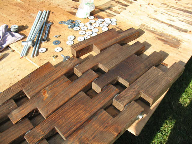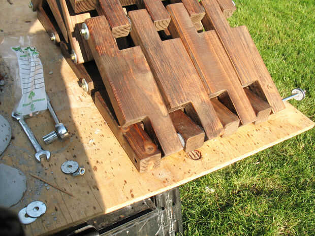 Cortar las barras a 15" o corta sin embargo sientes conferable (es el ancho de 4 2x4s 14"). Atornille la tuerca en el extremo y Deslice dos arandelas de empuje la varilla aunque las piezas, añadiendo arandelas de papel de lija entre cada pieza. Terminar al final con 2 arandelas fender y otra tuerca de grado 8.
