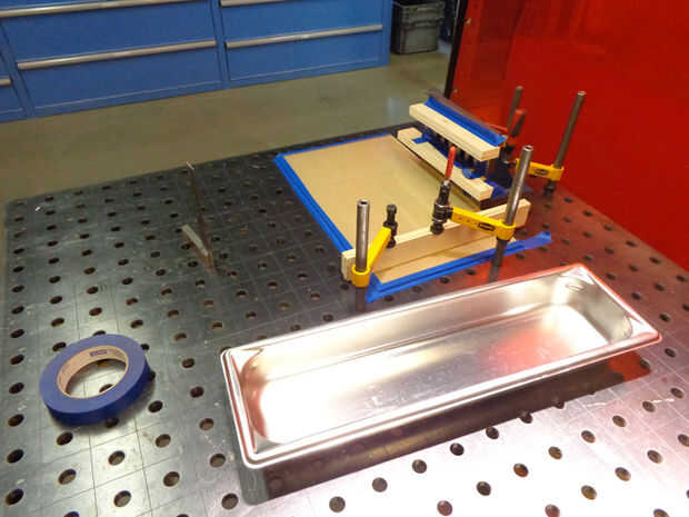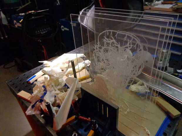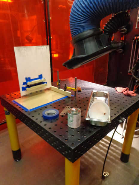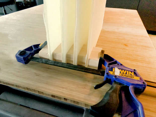 Paciencia está implicada, y espaciadores (para apoyar los paneles como se secan) y aquí un Consejo realizado por desgracia después de que el hecho: es en este momento (antes de pegar los listones) que desea quitar el frisket, a menos que haya suficiente espacio entre los listones para conseguir cómodamente la mano en quitar el frisket. Terminé roce el frisket de cada listón con mis dedos, haciendo que mis huellas a desaparecer de mis dedos y terminan en las láminas. Es posible que pueda tener que llevar este cuadro conmigo por la aduana cuando viajo para comprobar mi identidad en el futuro.