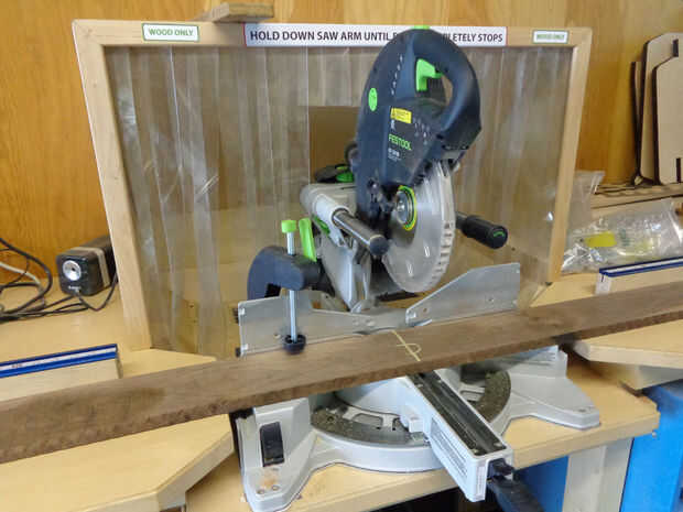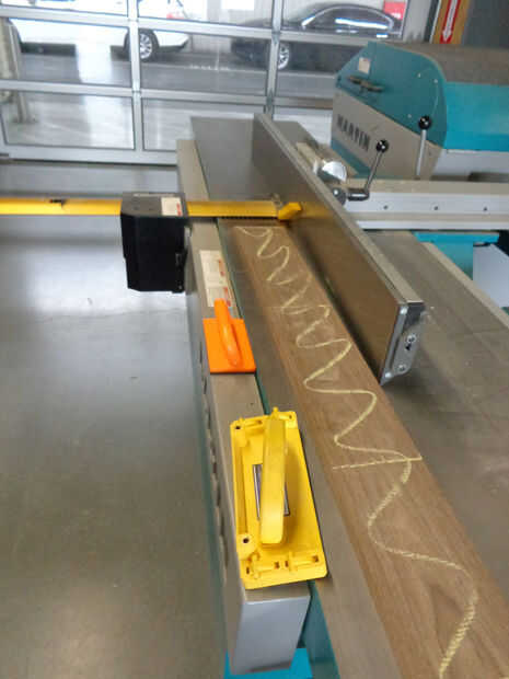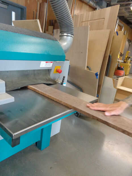 1. corte de la pieza (en este punto una pieza larga de madera de nogal) en bruto en la tronzadora.