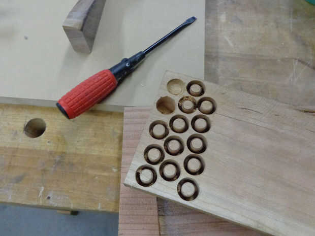 El Mei increíble (en el muelle 9) me mostró cómo, usando una broca especial, puede de hecho perforar sus propios tapones de madera poco, les pop fuera de la madera (!) con un destornillador y luego pegarlos en encima de los tornillos de la inserción en su caja.
