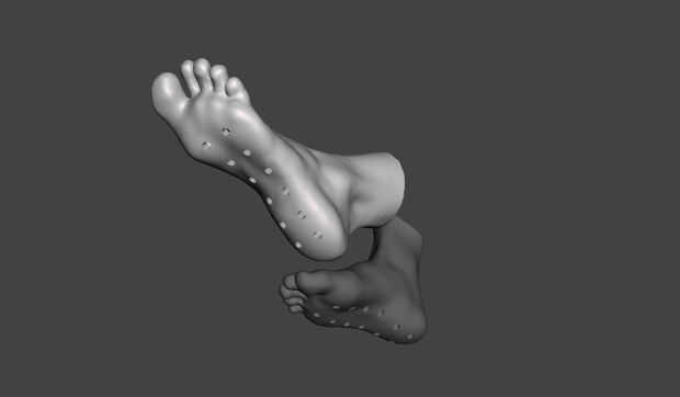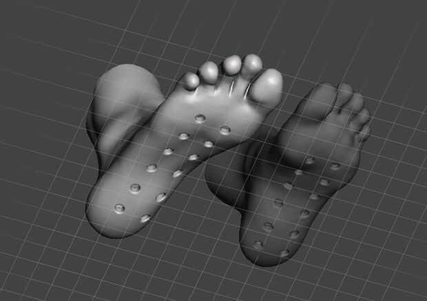 Los agujeros se agregaron a los pies Meshmixer anexando un cilindro al archivo, duplicar varias veces y después usando una diferencia booleana para sustraer esos diámetros circular de las plantas de la parte inferior de los pies.