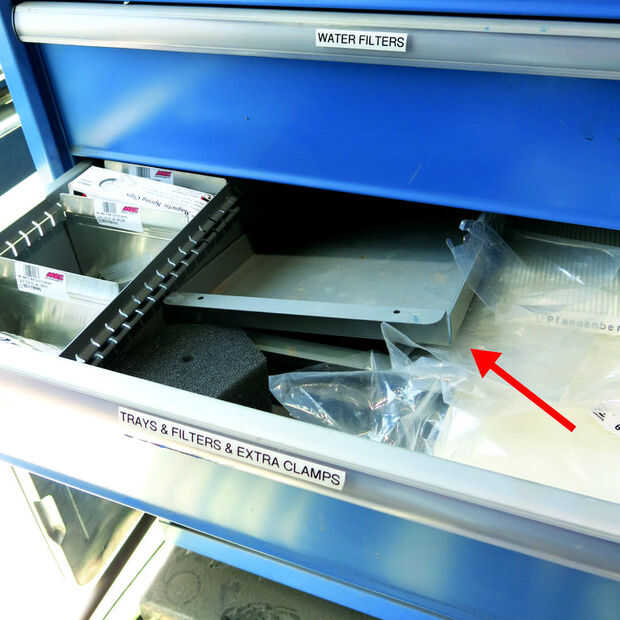 Haz una bandeja de la caja de Lista de chorro de agua azul. Pon esto debajo de la tolva granate pequeño. Esto cogerá el granate que está a punto de derramar y evitará que va por todo el lugar (a diferencia del ejemplo en la foto).