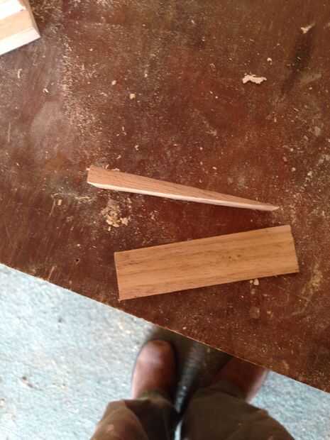 Configurar un 5 grado ángulo de corte usando un transportador/ingletes en el Hanon a dos pequeñas cuñas angulosas de desecho más. Pegamento a la base del reloj como pies. Esto resulta en el muelle en ángulo ligeramente hacia arriba ayudando a mantener el teléfono en su lugar mientras que en el muelle se carga.