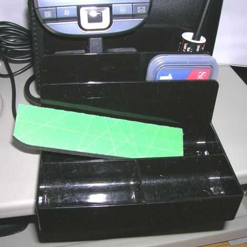 Cortar un trozo de alfombrilla de ratón para ajustar la apertura (la foto muestra la pieza verde mousepad). Puede que necesite más de una capa para mantener sus llaves teléfono accesible. Yo sólo soltar mi teléfono allí, abierto o cerrado, conectado al cargador o no.
