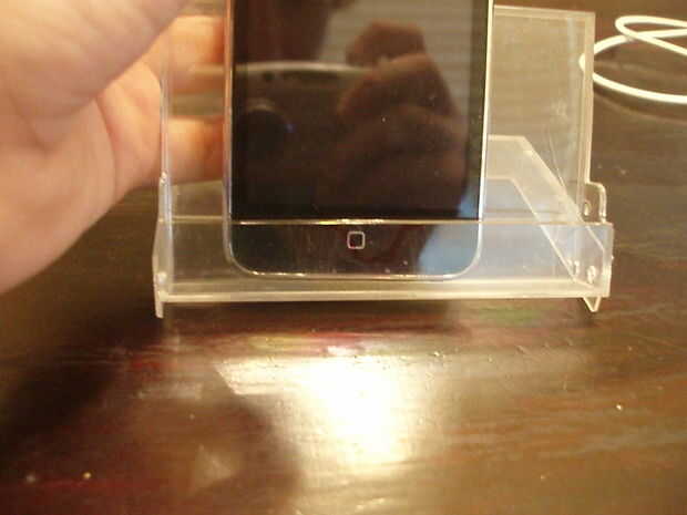 Con un taladro un agujero en el lugar donde estará el botón de inicio. será más arriba de lo que piensa porque los cables con "levantar" el ipod. Después de taladrar el agujero, podría haber tenido un poco bastante grande pero no lo hice así que tuve que hacerlo más grande con los alicates.