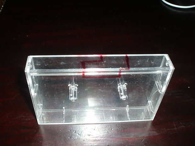 Corte un orificio en la parte inferior de la caja de cassette. Este se encuentra debajo de donde usted cortar el agujero para el botón de inicio. Esto es lo que ocurre al usar pinzas para tomar cada pieza poco a poco. Ya que la mayoría de ustedes manitas en Instructables Dremels, le recomiendo que utilice en su lugar. Este agujero de forma extraña era perfecto para mi cable conector y el cable de teléfonos juntos y para conectarse al dispositivo.