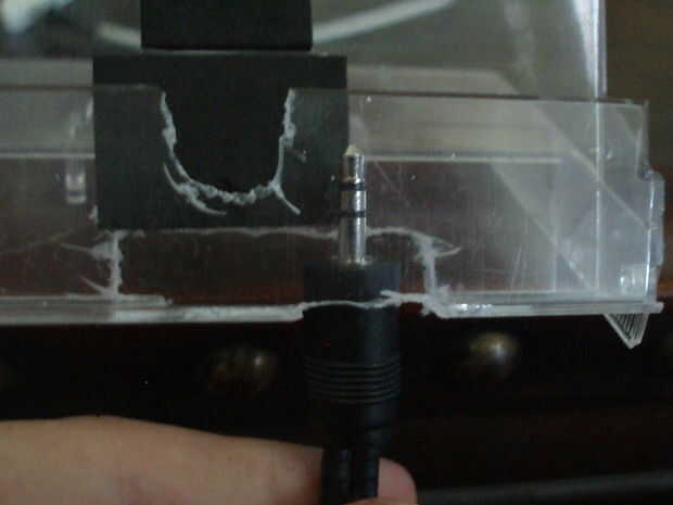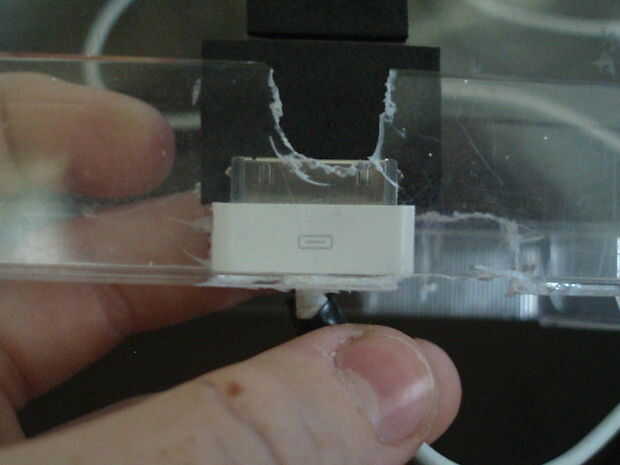 Colocar cada cable en uno a la vez. Tire el cable por el agujero ahora y conectarse con el dispositivo, luego el cable de audio. Empuje el ipod en la ranura y tire el cable adicional el agujero.