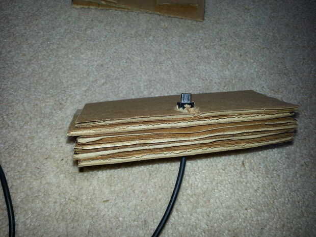 Esta es la parte difícil. Coloque el teléfono en la base y marque donde el puerto toca la base. Tomar las tijeras y hacer un pequeño corte a lo largo de esta marca. Hacer esto para cada rectángulo de cartón de la base superior. Asegúrese de que la marca esté en el mismo lugar en cada rectángulo. A continuación, ejecutar la punta del cargador a través de estos agujeros como en la imagen de abajo. Después de eso, montar el resto de la base bajo el alambre. Pase el cable por la parte posterior de la base.
