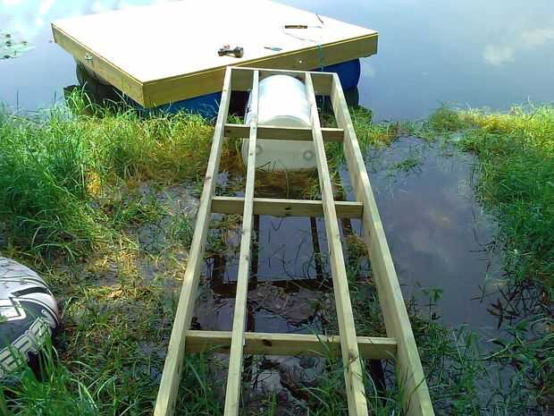 Ahora, esto es donde esto podría fácilmente no funciona para algunas personas dependiendo de su litoral. Mina tiene una colina poco agradable que la rampa puede sentarse en la tierra. Así que puse ese fin hacia abajo y el otro lado flotaba muy bien hacia fuera por la plataforma. Tuve que añadir alguna suciedad debajo del lado de la tierra para conseguir todo recto pero no era demasiado malo.