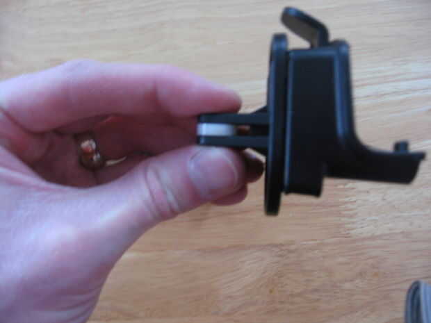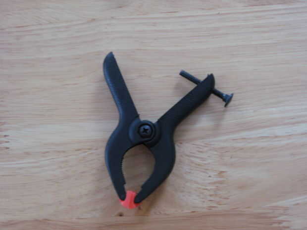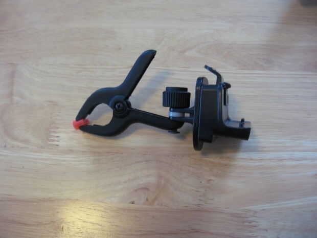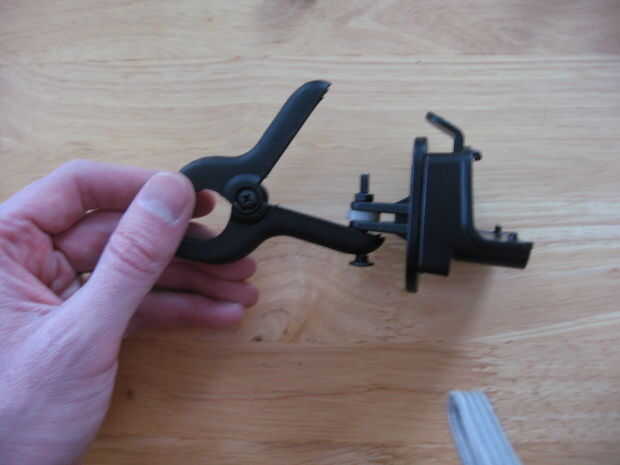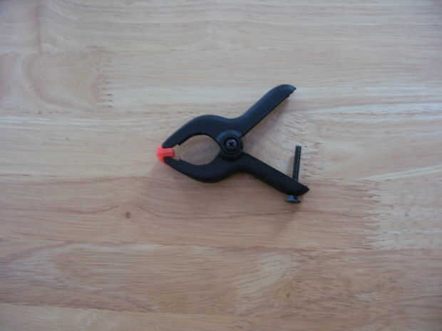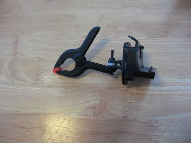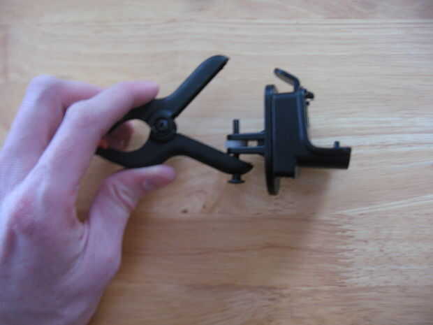 1) enrosque el perno en el agujero del mango inferior de la abrazadera del resorte. (Si la abrazadera del resorte no tiene un agujero, usted necesitará perforar uno. Sugiero un ajuste apretado. También el mango inferior fue elegido como el GPS a la manija superior de montaje habría salido apuntando hacia el techo.) Tengo perno comenzó y luego girar la abrazadera alrededor hasta que el perno en la medida en que se podría ir.