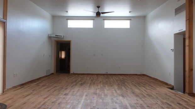 La habitación era aproximadamente de 750 pies cuadrados con un ancho de 20' en el extremo este y una anchura de 24' en el West end. La longitud total de la habitación fue de 33 pies. La planta fue terminada en agosto de 2013 y ahora ha tenido un año de uso. El propietario está organizando una serie de sesiones de improvisación musical y danzas de diversos tipos. El piso tiene una desviación hacia abajo de hasta 1/4" y la desviación se extiende sobre un círculo de 8' alrededor de cuatro bailarines.